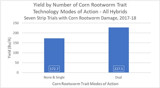 The graph above shows the overall advantage of dual mode of action corn rootworm traits compared to no corn rootworm and single mode of action trait packages in seven high pressure fields from 2017-18.